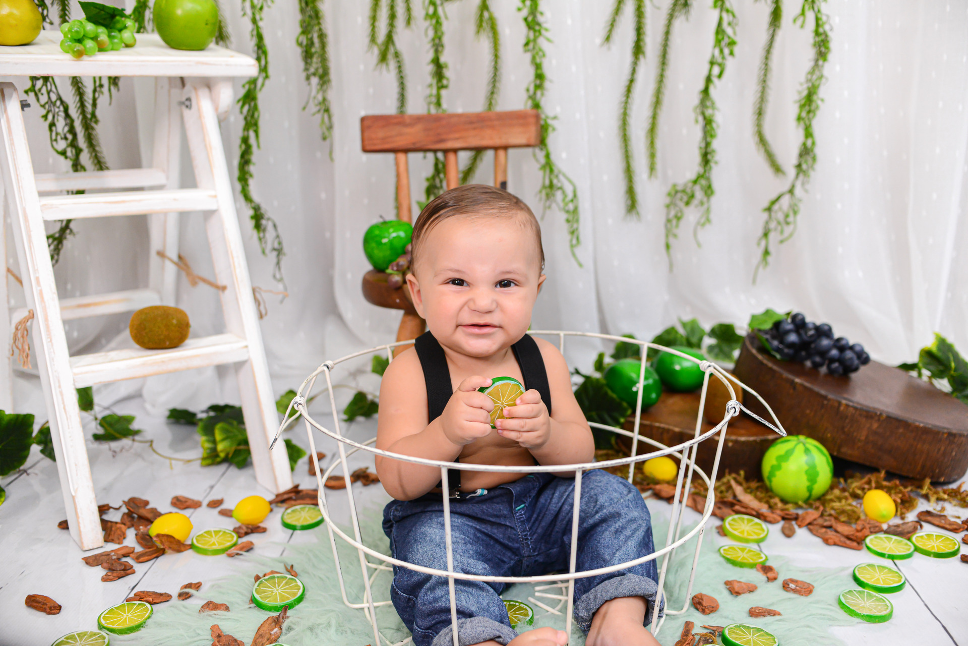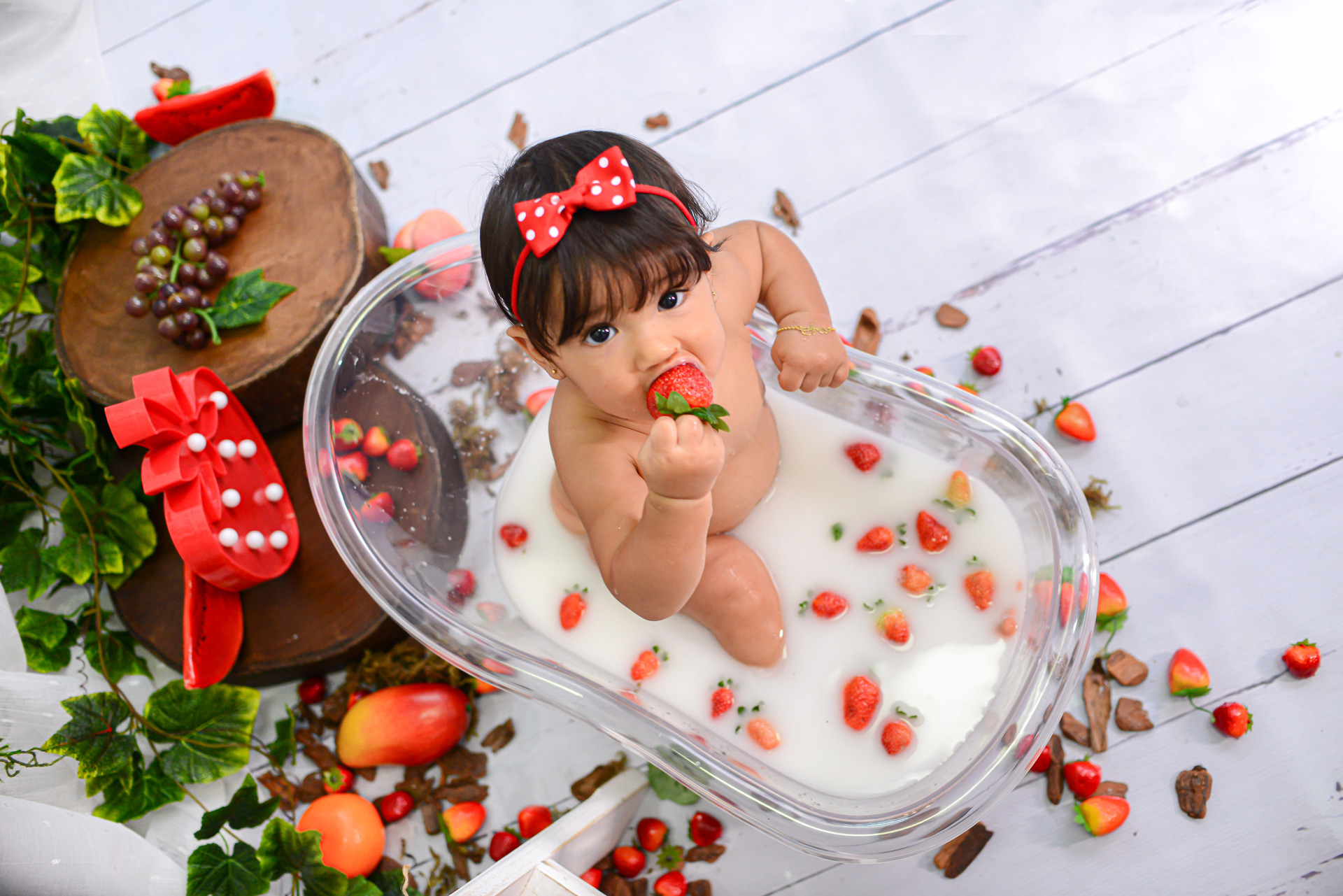 Um ensaio divertido com uma decoração clean e cheio de frutinhas, onde o bebê poderá experimentá-las e no final tomar um delicioso banho de leite pra se refrescar e curtir essa bagunça super divertida!